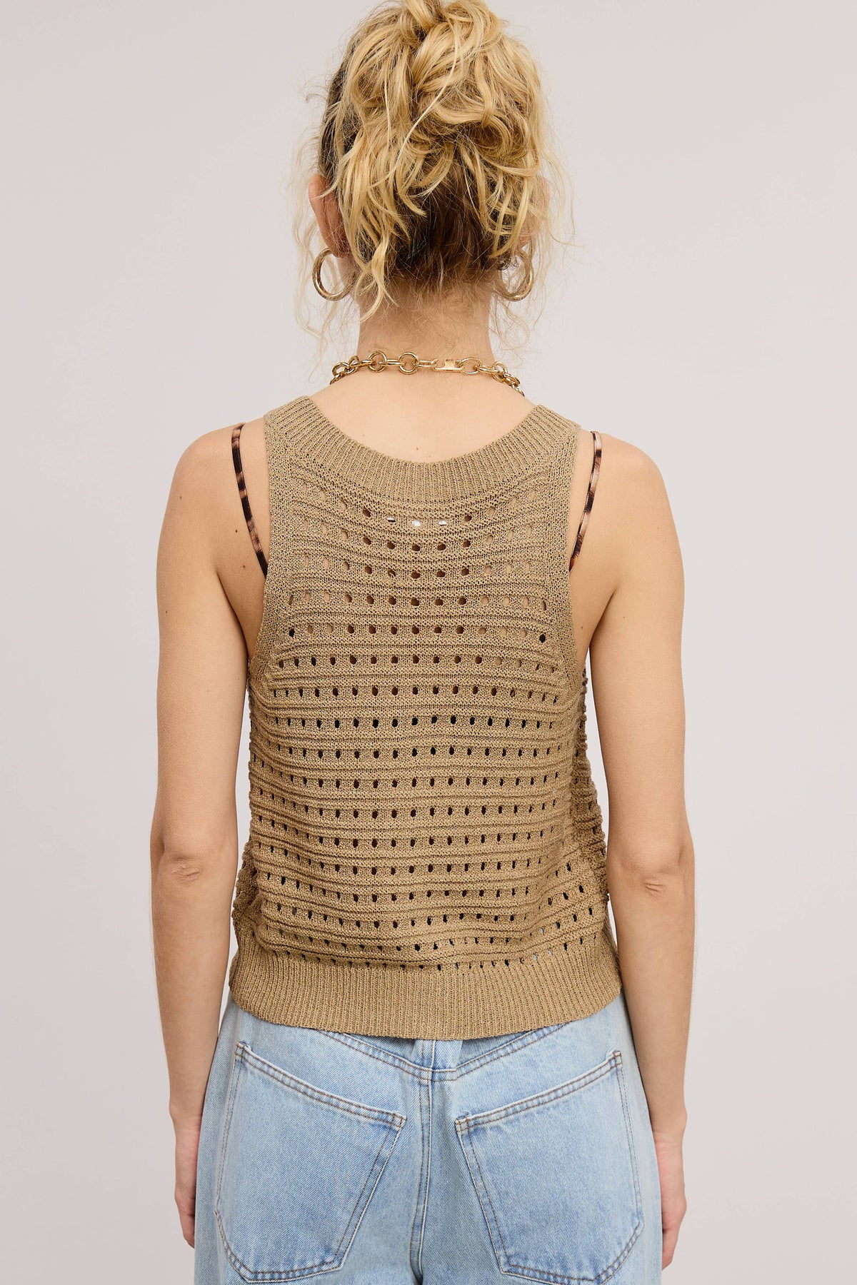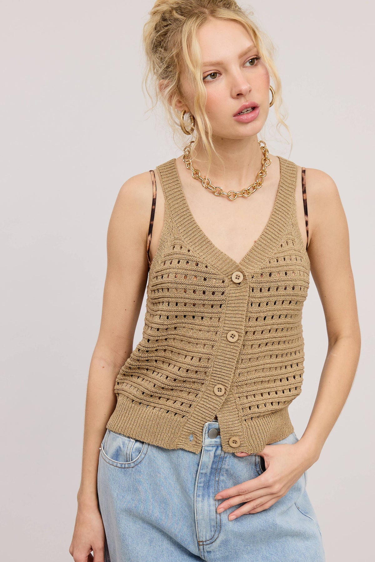 This punch work stitch knit sweater tank top features a ribbed V-neckline, adjustable straps, and front button closure. The relaxed, regular-length fit allows for versatility, and you can unbutton the bottom few buttons to style it as a cropped cardigan. A perfect piece for a laid-back yet fashionable look.